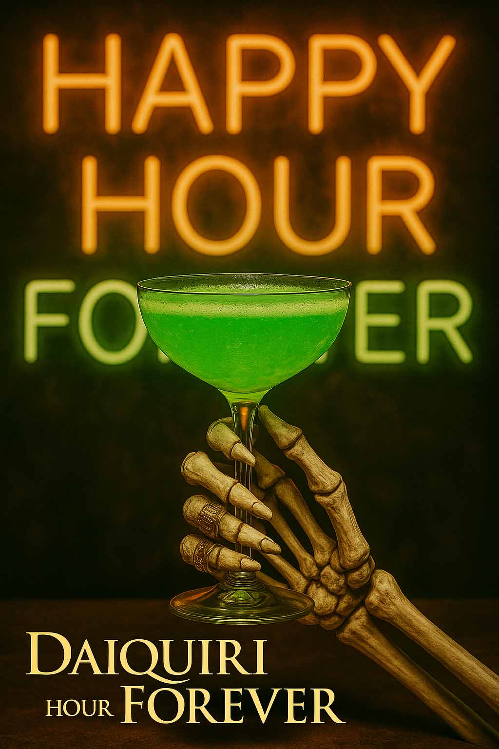 • This isn’t your average bar art. Daiquiri of Damnation brings a chilling glamour to your walls, with a hyper-realistic depiction of a radiant green daiquiri held by a skeletal hand dripping in gold. Behind it, the glowing “Happy Hour Forever” neon sign blurs the line between afterlife and afterparty.