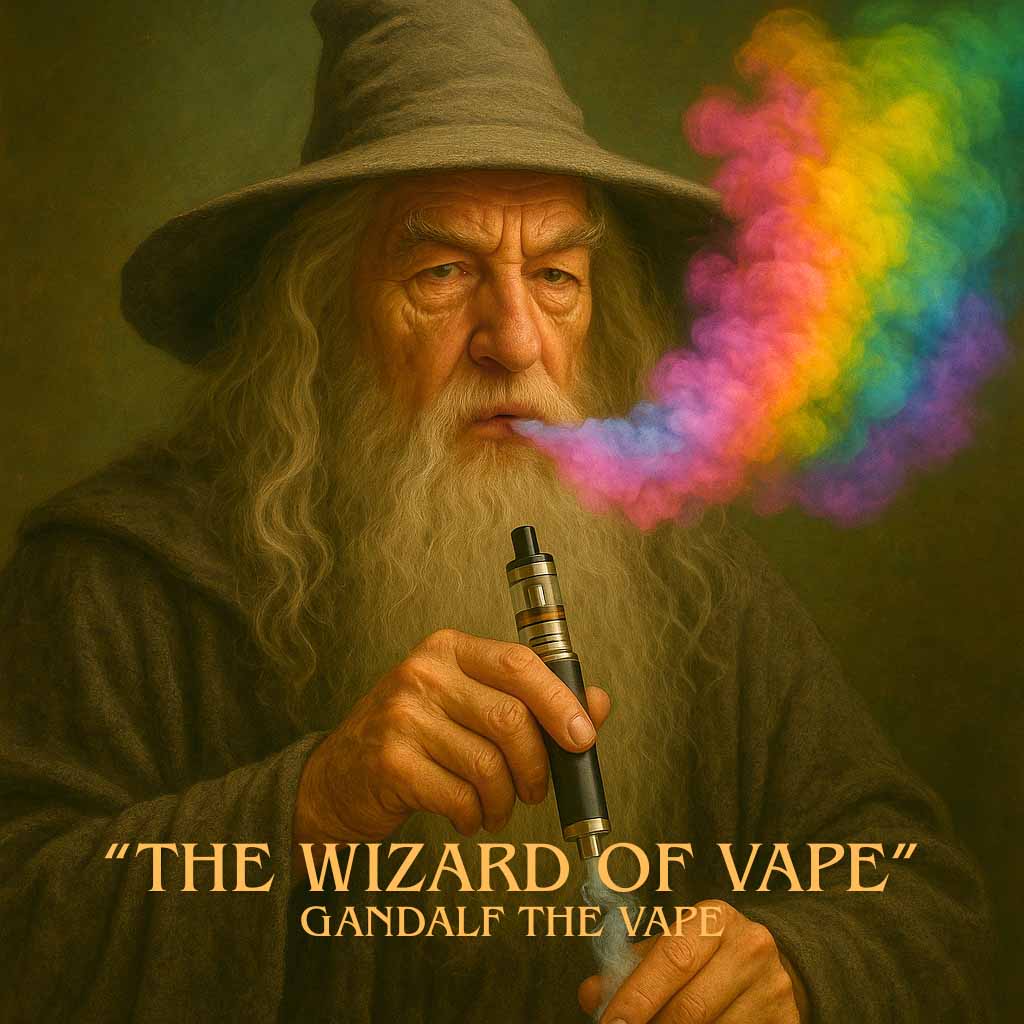 Forget pipe-weed—Gandalf the Vape is here. This hyperrealistic parody transforms the wise and solemn wizard into a modern icon of vape culture. With a sleek device in hand, he exhales a magnificent rainbow cloud, blending epic gravitas with absurd irony.