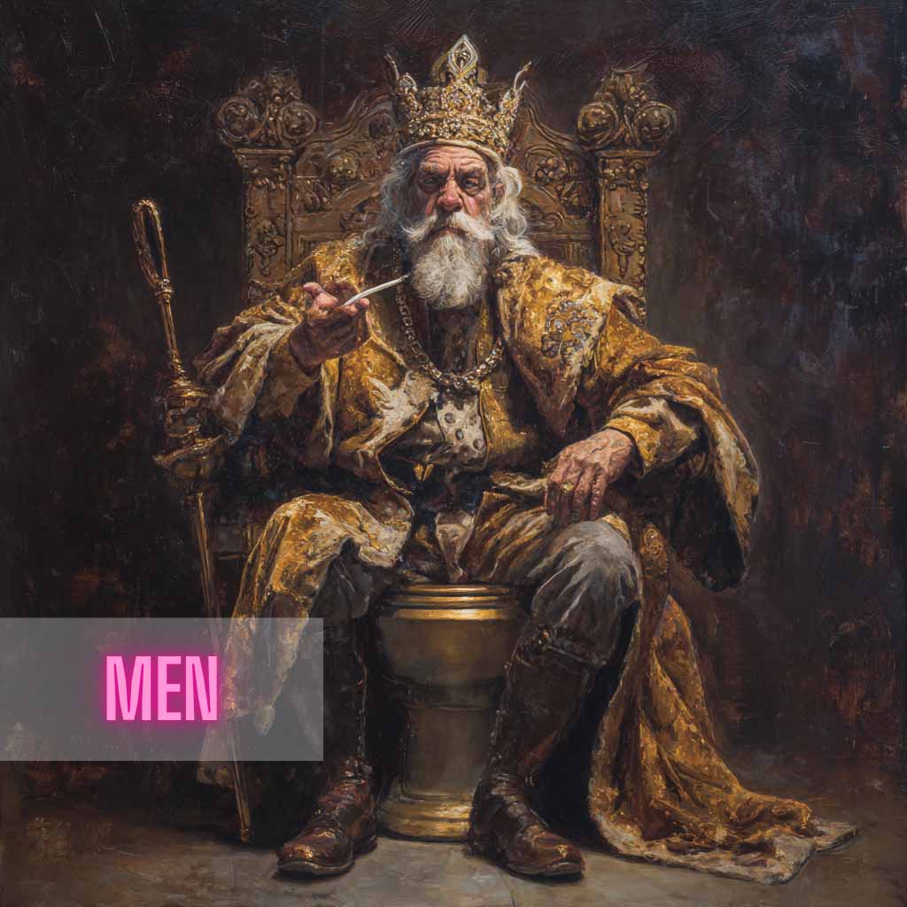 • Forget dull restroom symbols—welcome your guests with true majesty. This artwork presents a hyperrealistic old king, majestic crown on his head, robes richly embroidered, seated proudly on his golden toilet. A glowing neon “MEN” adds a modern and playful twist.
