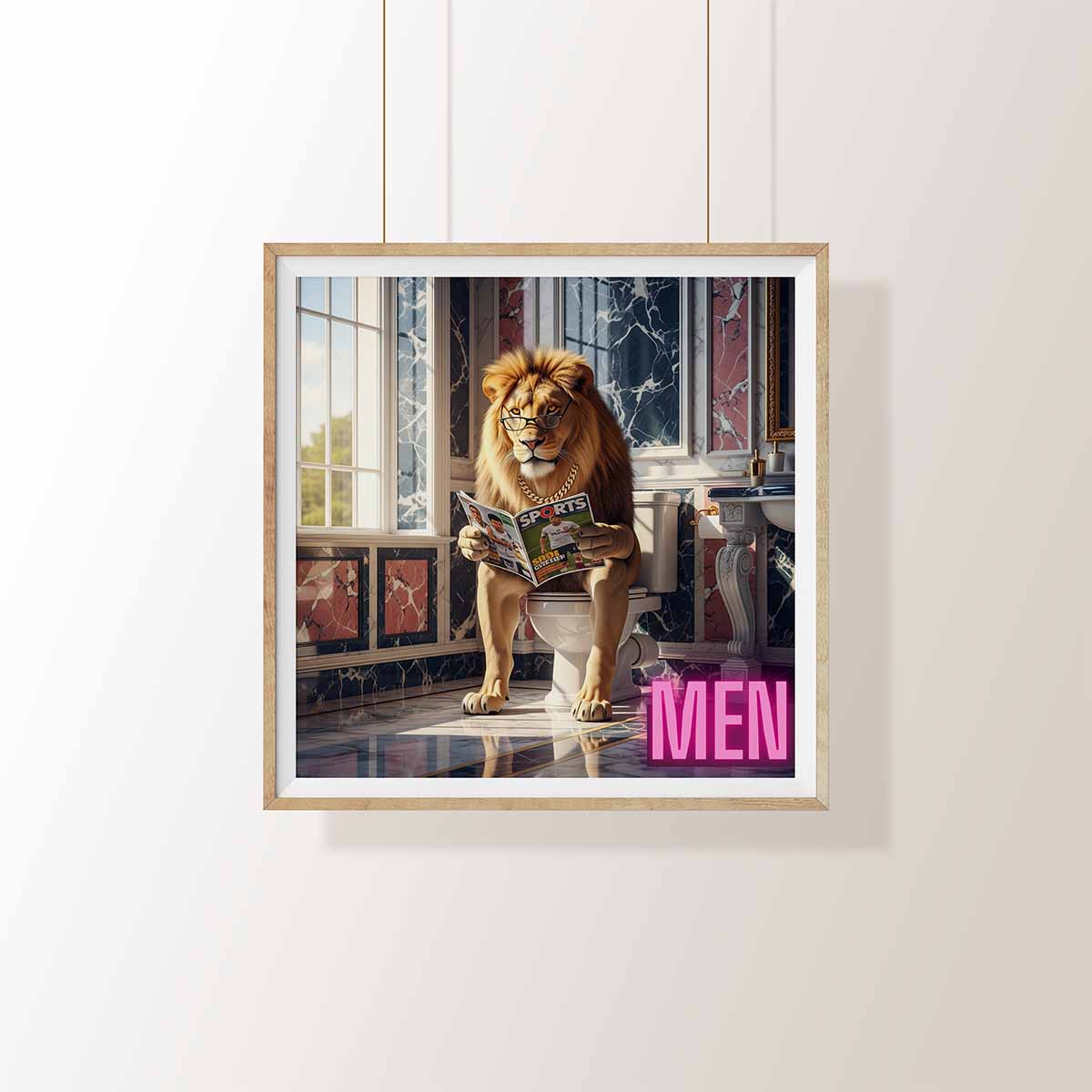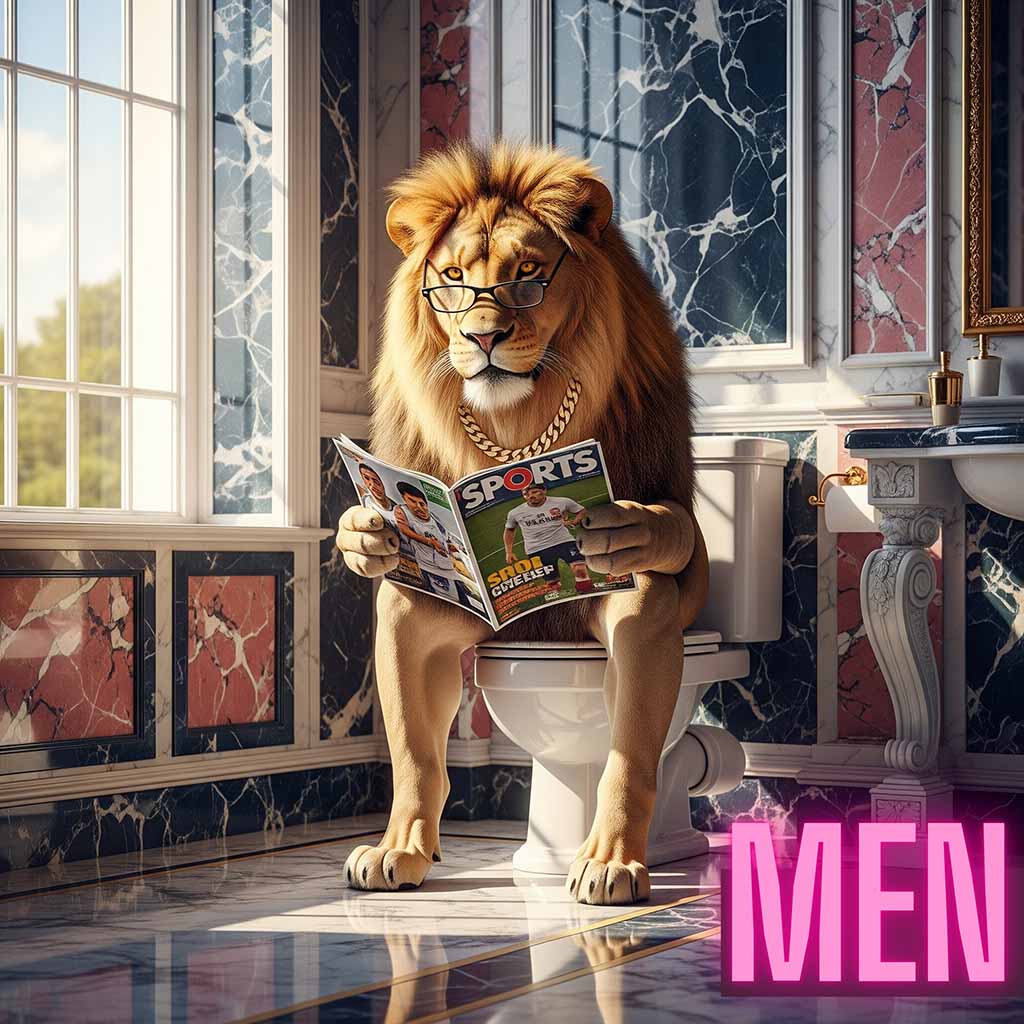 When power meets parody: Men – Lion Throne reimagines restroom signage with wild originality. A majestic lion, complete with glasses and a chunky gold chain, sits regally on the toilet, absorbed in a sports magazine. Beside him glows a neon “MEN” sign, blending everyday banality with surreal grandeur.
