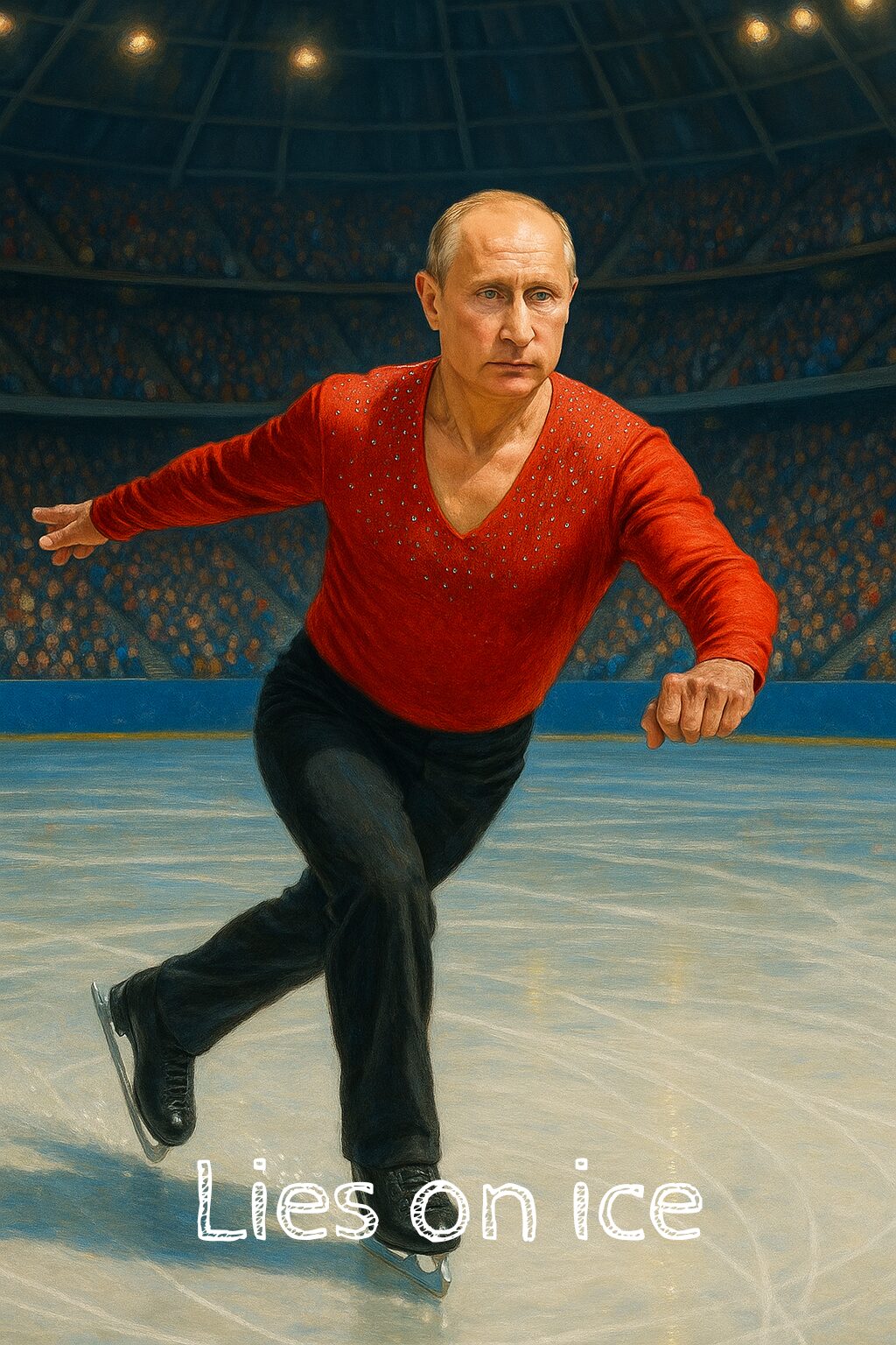 Power and grace collide in this satirical masterpiece. The Ice Dictator portrays a notorious strongman not in the battlefield of politics, but gliding across the ice in a sequined red costume, exuding elegance in the most unexpected setting.