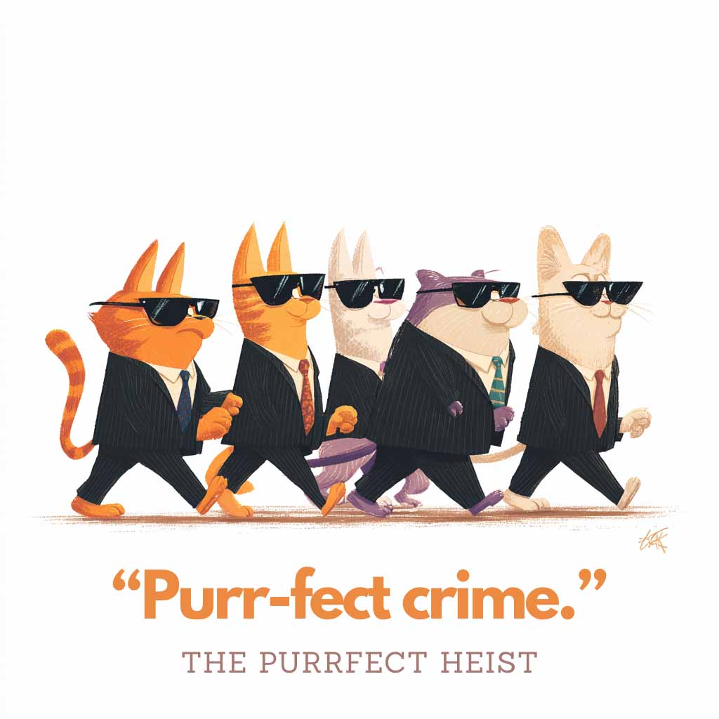 What happens when you cross gangster cinema with feline charm? The Purrfect Heist delivers the answer: a lineup of cats dressed in sleek black suits and shades, strutting with all the confidence of a Hollywood crime crew.
