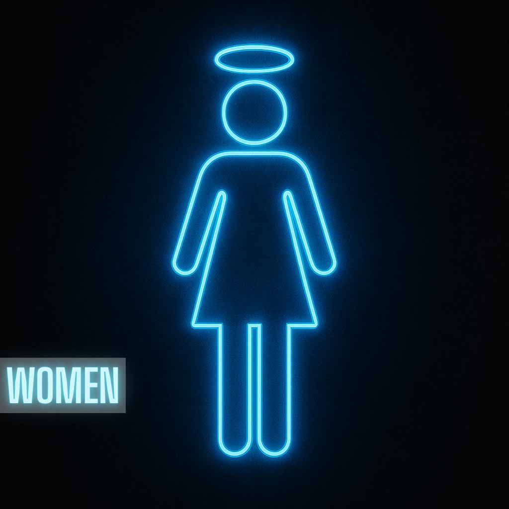 • The classic women’s restroom sign just ascended. Women – Neon Angel Icon transforms the everyday female restroom symbol into a radiant parody: glowing blue neon with a halo of light. Minimal yet loaded with irony, it’s a bold décor statement for venues seeking flair.